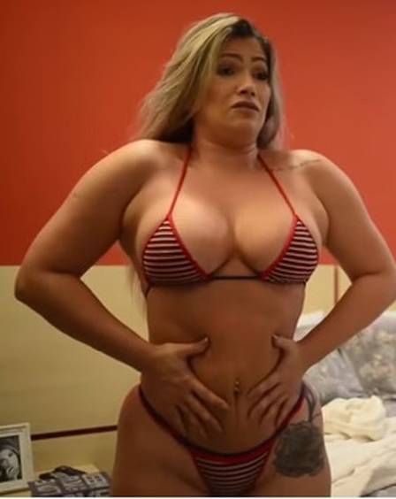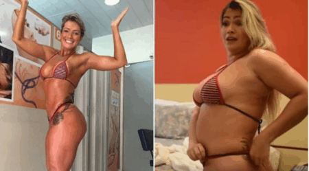 Fani Pacheco mostrou a dificuldade de vestir um biquíni tamanho P que ela usou em 2015, quando pesava menos 15kg a mais, a ex-BBB penou para entrar no modelito