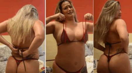 “Parece um biquíni de criança, mas é meu. Vocês acreditam que há um ano eu estava vestindo aquele biquíni?. Nessa época eu estava com 65kg, magra, e achava que estava com pelanca sovacal”, explicou ela, que quase mostra demais no vídeo que foi ao ar na noite desta quinta-feira.