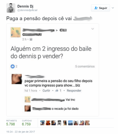 Na publicação, o internauta procurava ingressos para o Baile do Dennis, festa estrelada pelo maior produtor musical de funk, o DJ Dennis. Sua ex-mulher, então, comentou: “Pague primeiro a pensão de seu filho e depois você compra ingresso para o show, beleza?”.