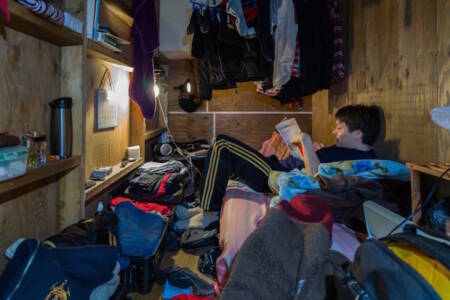 Durante a sua estadia em Tóquio, o fotógrafo Won Kim ficou hospedado em um escondido e pequeno hotel. Na verdade, nem dá para dizer que era um hotel: os quartos eram compartimentos construídos em um andar de um edifício comercial. Separados apenas por madeira compensada sem acabamento, não era possível ficar em pé nesses quartos, que também não possuíam janela ou porta, apenas uma cortina na entrada – para garantir o mínimo de privacidade.