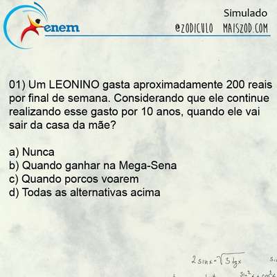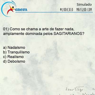 A galera do Zodiculo preparou um “simulado” do Enem (Exame Nacional do Ensino Médio) com 12 questões sobre cada signo. E a página já avisa: são “previsões furadas do zodíaco”. Então relaxe e se divirta depois dessa maratona de provas do fim de semana.