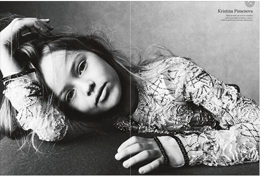 Nascida em Moscou (Rússia), em dezembro de 2005, Kristina Pimenova é modelo desde os cinco anos de idade e já estampou a capa da Vogue Bambini – publicação da Vogue Itália dedicada as crianças – além de fazer parte de campanhas da Benetton e Roberto Cavalli.
