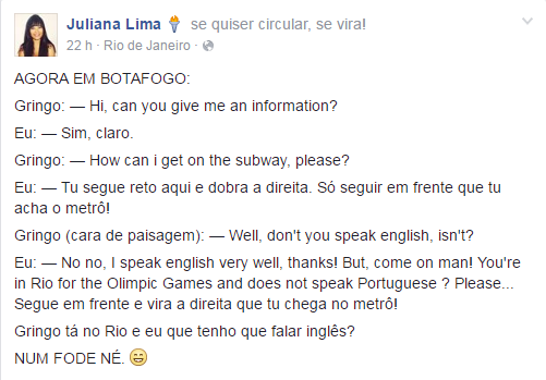 Tudo começou quando um post de Juliana Lima viralizou no Facebook. Ela conta que “Agora em Botafogo”, cujo termo foi um dos mais citados no Twitter na noite da última quinta-feira, 11, se recusou a falar em inglês com um gringo que pedia informação.