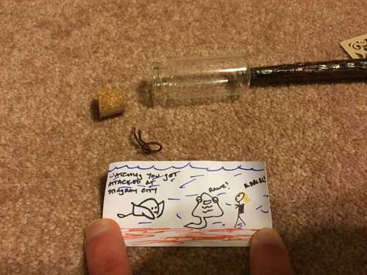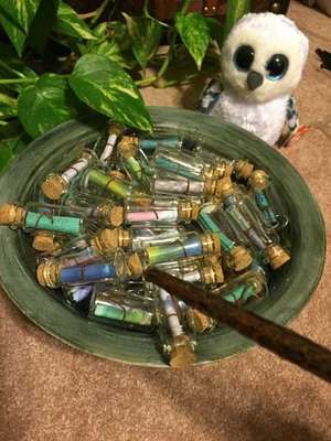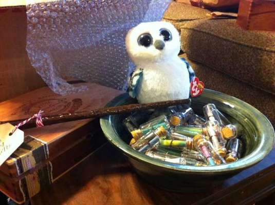 Primeiro, Matt Brocone entregou à esposa uma coruja branca de pelúcia com uma carta de Hogwarts e uma varinha. Daí ele fez algumas aulas de cerâmica para fazer a bacia (e até entalhou as iniciais do casal na parte de trás dela) e comprou pequenos frasquinhos de vidro. Matt arrumou alguns papéis brilhantes e coloridos, escreveu neles as memórias mais especiais que passou junto a sua parceira, enrolou-os como mini pergaminhos e os colocou nos frascos.