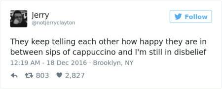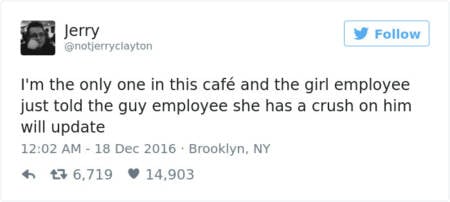 Às vezes acontecem coisas tão inacreditáveis na vida que parecem ficção. Jerry estava sentado em um café quando o casal de baristas atrás do balcão declarou seu amor secreto um pelo outro.