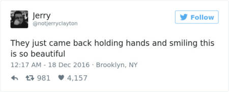 Então eles voltaram de mãos dadas e sorrindo. Isso é tão lindo!