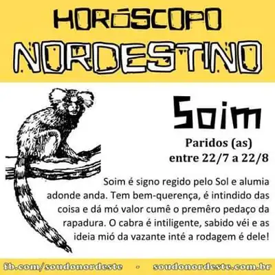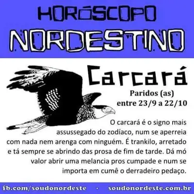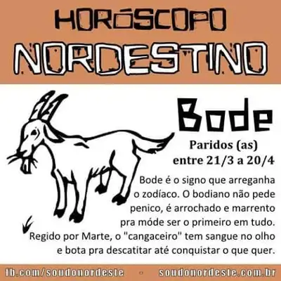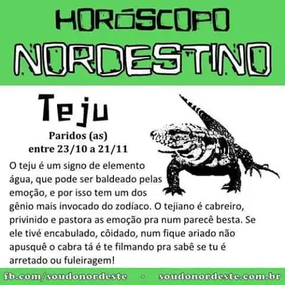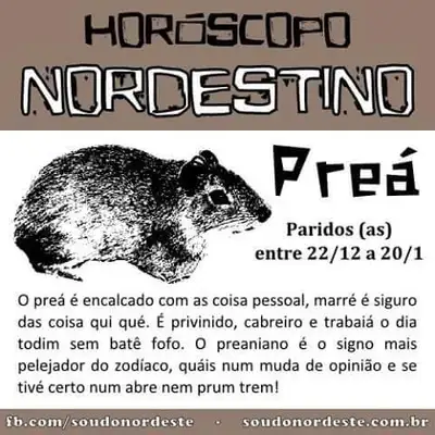 O site Sou do Nordeste criou um horóscopo divertidíssimo baseado em elementos nordestinos. As descrições bem humoradas trazem expressões e aspectos culturais típicos da região. Cururu, jumento, preá, teju ou bode? Saiba qual o seu signo neste zodíaco arretado: