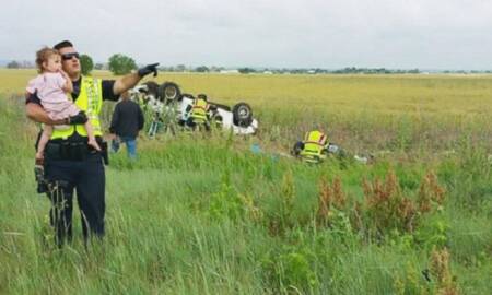 Esta imagem está ganhando notoriedade na internet e mostra o momento exato de um policial tentando distrair uma garotinha, após o acidente de carro de sua família.