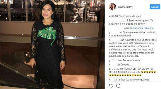 Após comparar Rafaela Justus, filha de Ticiane Pinheiro, ao personagem Chuck, a socialite norte-americana Day McCarthy teve a conta no Instagram bombardeada por brasileiros que, óbvio, repudiaram a atitude.