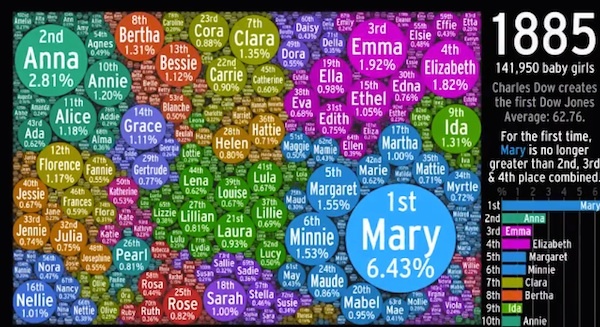 A página do YouTube Abacada criou um vídeo com vários gráficos de bolhas, que mostram a evolução dos nomes femininos mais populares nos Estados Unidos desde o ano 1880 até os dias atuais. As informações são do site Design Taxi.