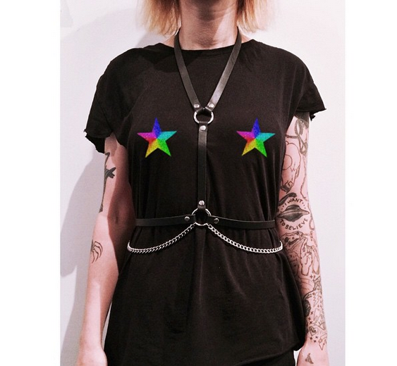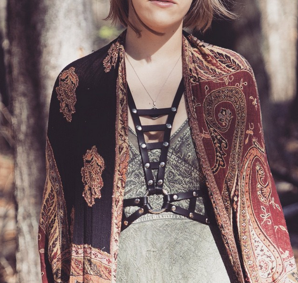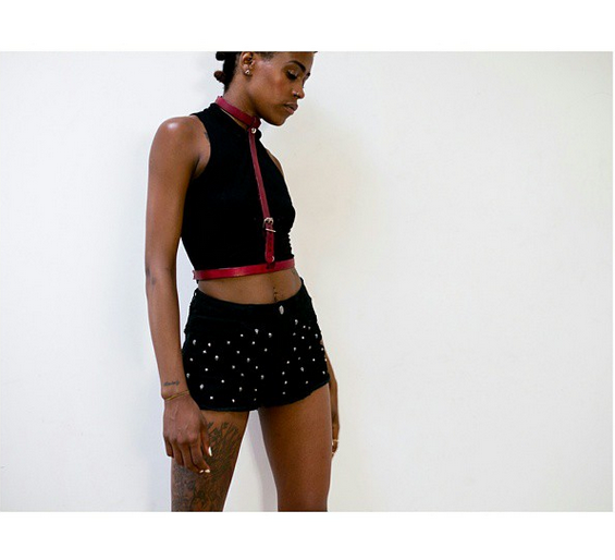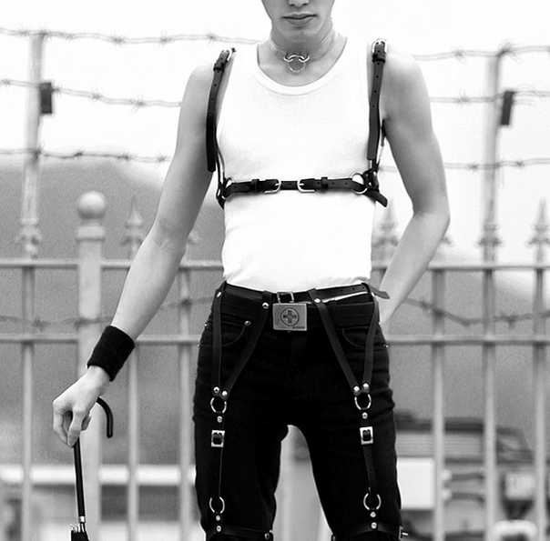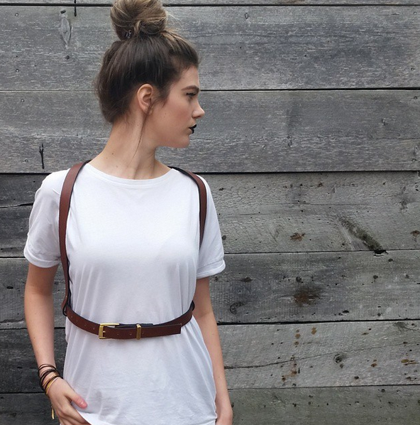 Normalmente feito com tiras de couro e materiais encorpados, o acessório é basicamente uma adaptação fashion das “Safety harness”, aquelas cintas de segurança, usadas como proteção.