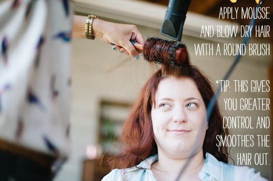 Primeiro passo – Aplique o mousse no cabelo e, com o auxílio da escova vá secando o cabelo. Isso lhe dará maior controle e suavidade para manusear o cabelo.