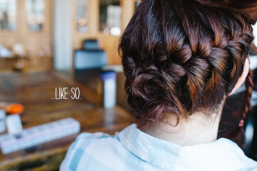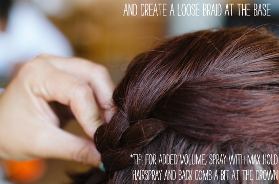 Sétimo passo – Pegue a parte de cabelo dividida em “U” e faça uma trança simples, frouxa. Com um grampo, prenda o restante do cabelo dentro das outras tranças.