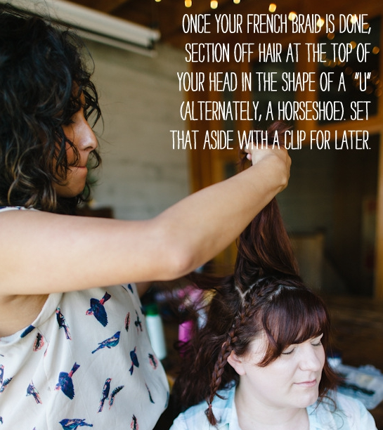 Quarto passo – Feito a trança francesa da lateral, com a ajuda de grampos, separe a parte do cabelo que está localizada no topo da sua cabeça, criando um “U”.