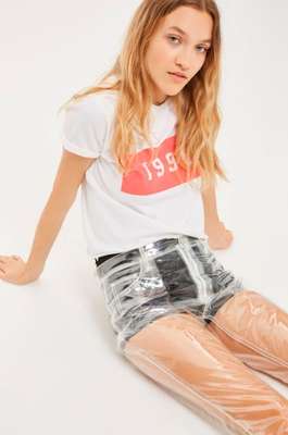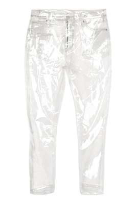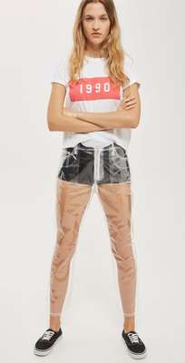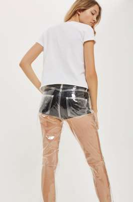 A nova tendência, por sua vez, é mais ousada: peças e acessórios de plástico transparente. Vale para bolsas, sapatos e calças, como é o caso deste lançamento da Topshop: