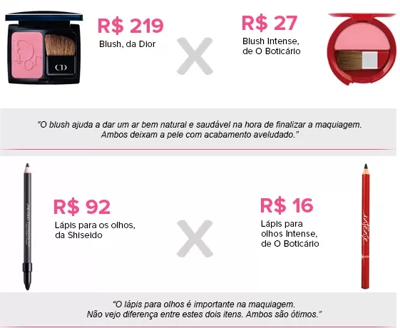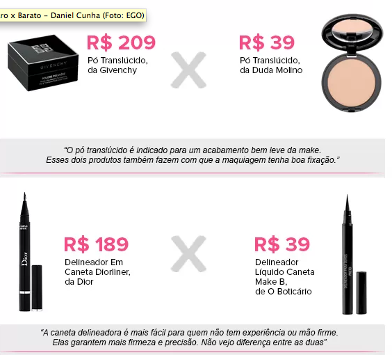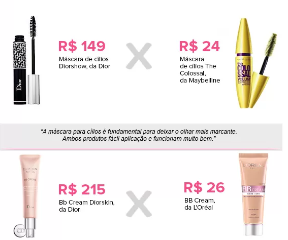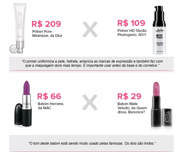 Um dos maquiadores de celebridades do mundo artístico, Daniel Cunha, fez para o site EGO uma lista de comparações para quem quer um produto mais em conta. Confira: