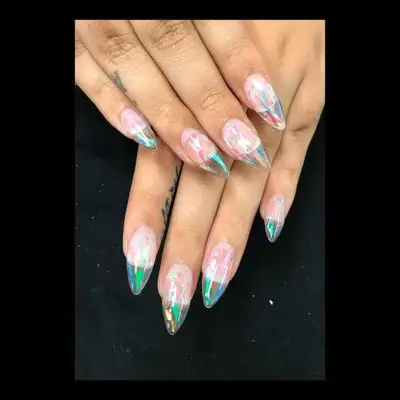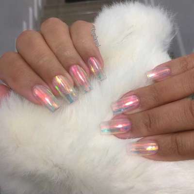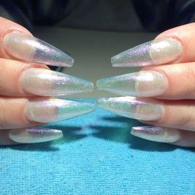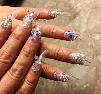 Em vez de pintar as peças com cores sólidas, a ideia é cobri-las com brilho ou outra cobertura translúcida (as iridescentes são as favoritas). Quem está aderindo à moda costuma deixar as unhas bem longas, para a transparência ficar mais evidente. Veja alguns exemplos: