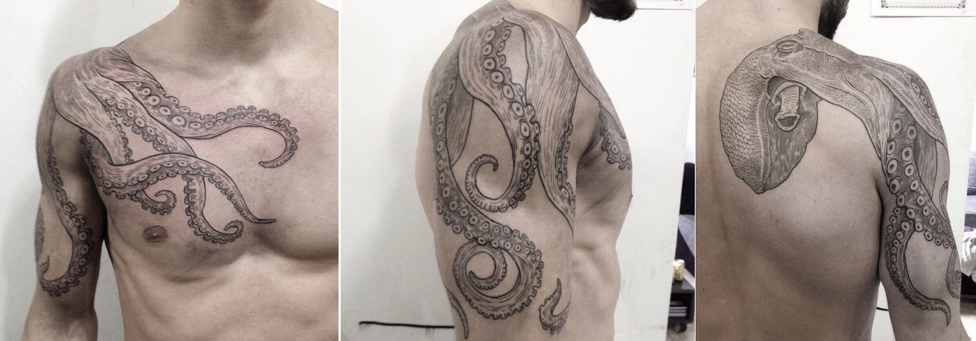 Basta caminhar entre a região da Avenida Paulista e da Augusta, para alguém me perguntar se a tatuagem que carrego no peito foi feita por Rômulo Pacheco – tatuador mineiro, de Belo Horizonte, que com pouco mais de dois anos de estrada desenvolveu um trabalho único, marcado pelo uso de hachuras, super autoral e, por isso, altamente