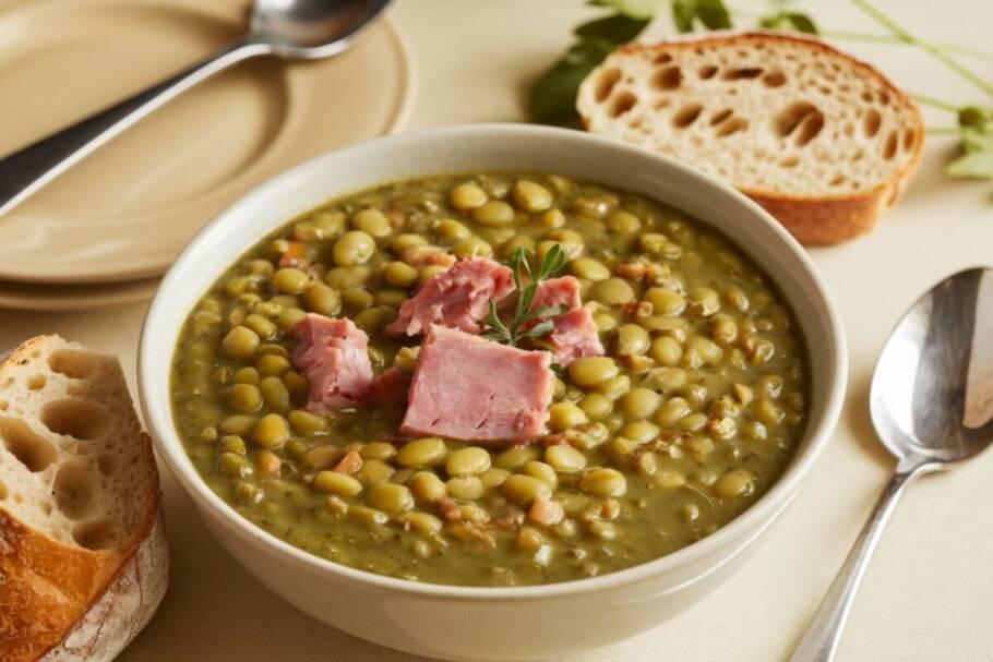 Lave a ervilha seca em água corrente e reserve. Em uma panela, aqueça o azeite de oliva em fogo médio. Adicione a cebola e o alho e doure. Acrescente a cenoura e o presunto defumado e refogue por 5 minutos, mexendo ocasionalmente. Junte a ervilha seca e cubra com água. Tempere com sal e pimenta-do-reino. Cozinhe até a ervilha e a cenoura ficarem macias. Caso a sopa fique muito grossa, coloque um pouco mais de água até atingir a consistência desejada. Sirva em seguida.
