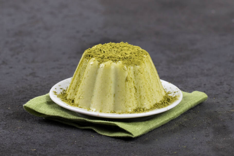 Em uma panela, misture o leite vegetal, o matcha, o mel, a baunilha e o amido de milho até ficar homogêneo. Leve ao fogo médio, mexendo sem parar, até começar a engrossar levemente. Enquanto isso, hidrate a gelatina com a água e dissolva conforme as instruções da embalagem. Retire a panela do fogo, adicione a gelatina dissolvida e misture bem até incorporar completamente. Distribua a mistura em uma forma de pudim levemente untada com óleo de coco. Leve à geladeira por pelo menos 4 horas ou até firmar bem. Desenforme com cuidado e polvilhe matcha por cima antes de servir.