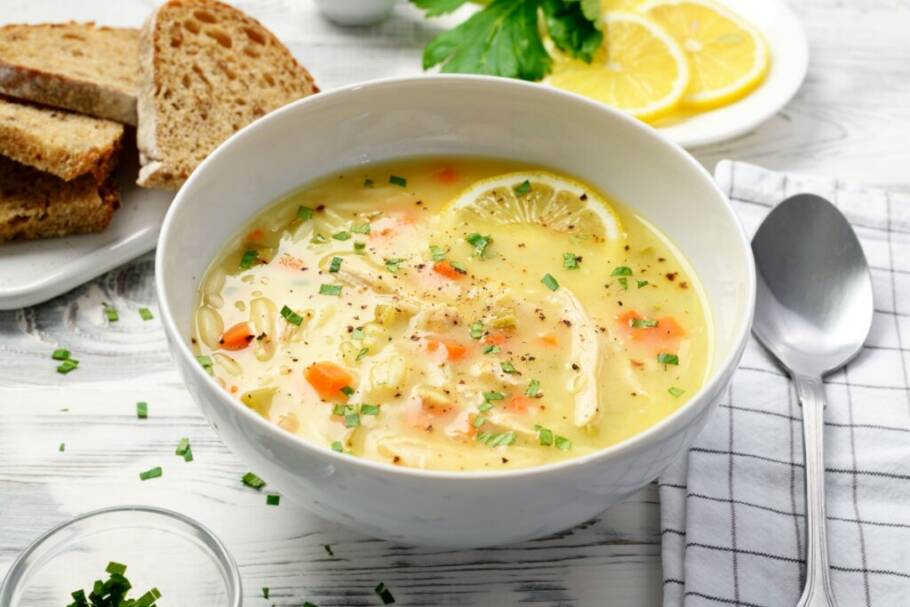 Retire o frango da panela, desfie com um garfo e devolva à sopa. Junte a massa de orzo e cozinhe até ficar al dente. Desligue o fogo e tempere com sal, pimenta-do-reino e suco de limão. Sirva decorado com rodelas finas de limão e cheiro-verde.
