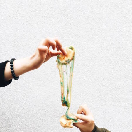 Nesta versão vibrante do sanduíche, cada cor tem um sabor diferente. O verde é queijo e manjericão; o vermelho, é com molho de tomate; o amarelo é uma mistura de muçarela, cheddar, Emmental e Gruyere; enquanto que o azul é salpicado de lavanda. Ou seja: não é nojento e, se bobear, fica bom.