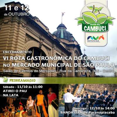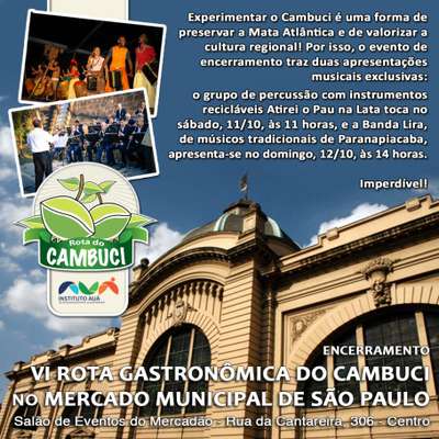 O evento terá entrada Catraca Livre e acontecerá no Salão de Eventos do Mercadão, junto à tradicional feira de artesanato, com exposição e venda dos produtos à base de Cambuci (cachaças, doces, salgados, cosméticos, entre outros) pelos produtores locais. Haverá também degustação pelo público, show do grupo de percussão com instrumentos recicláveis Atirei o Pau na Lata (sábado, às 11 horas) e da tradicional Banda Lira, de Paranapiacaba (domingo às 14 horas).
