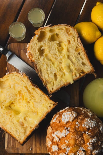 Panettone de Limão Siciliano com Creme de Limoncello: massa artesanal de fermentação natural com pedaços de limão siciliano e recheio cremoso de limoncello, em edição limitada e embalagem comemorativa. Feito em parceria com a Qui o Qua.