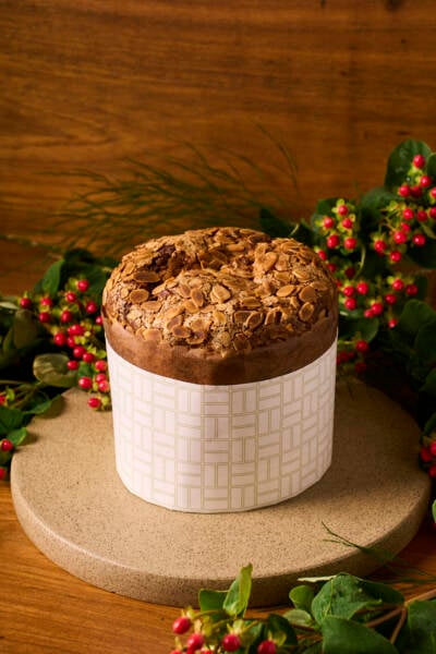 Panetone de Laranja Confit, Chocolate & Amêndoas: fermentação natural com laranja confitada, chocolate e amêndoas — versão elegante para presentear.