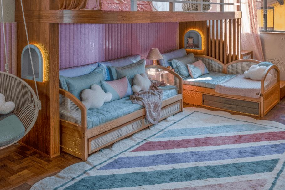 Espaço limitado pode ganhar novas camadas com a criação de um mezanino lúdico. A estrutura elevada funciona como refúgio simbólico e área de leitura, com estantes, tapetes e almofadas. A verticalização otimiza a metragem e propõe um novo olhar para o ambiente.