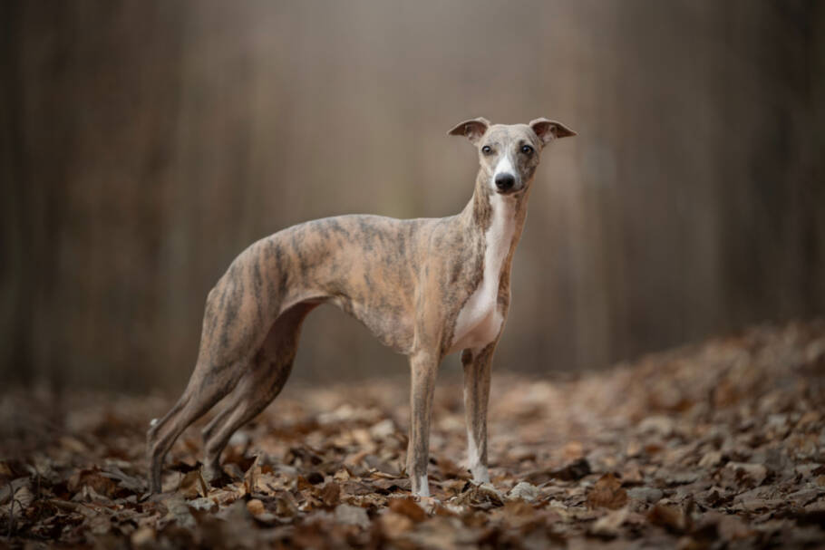 O whippet é considerado uma versão menor do greyhound, mas com personalidade própria. Surgiu na Inglaterra no século XIX, a partir do cruzamento entre greyhounds e outras raças menores, com o objetivo de criar um cão rápido e compacto para caçar coelhos. Mede entre 44 e 51 cm e pesa de 10 a 15 kg. Sua pelagem é curta, macia e apresenta grande variedade de cores.