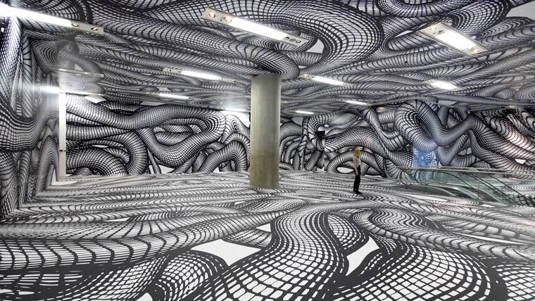 Tubos pintados, favos de mel e faixas criam ilusões espaciais únicas trazendo arte e movimento para os espaços da cidade que antes era sem vida.