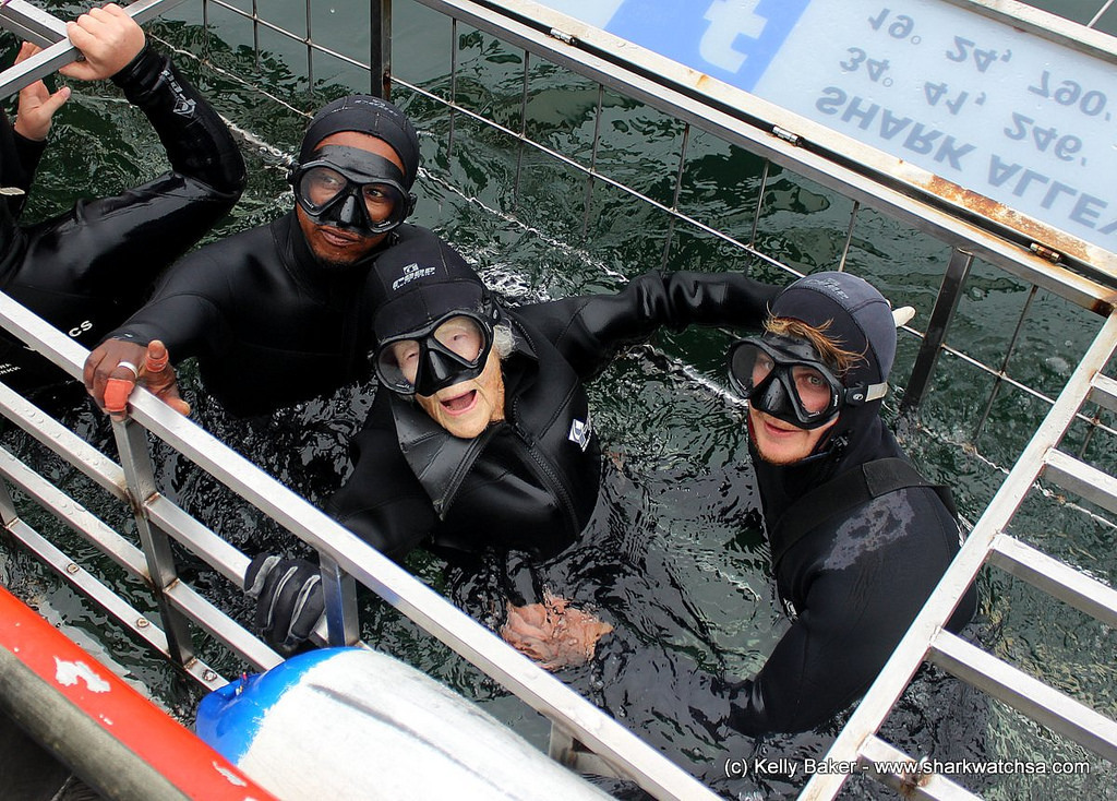 Aos 100 anos, sul-africana salta de paraquedas e mergulha com tubarões
