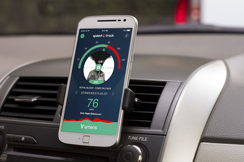 Em vez de avisos sonoros, o Speed-O-Track utiliza as tecnologias do Spotify e do Google Maps para ajudar o motorista a respeitar os limites de velocidade das ruas e rodovias.