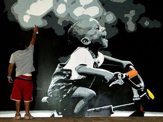 Artista abusa do cinza para expressar alegria nos muros