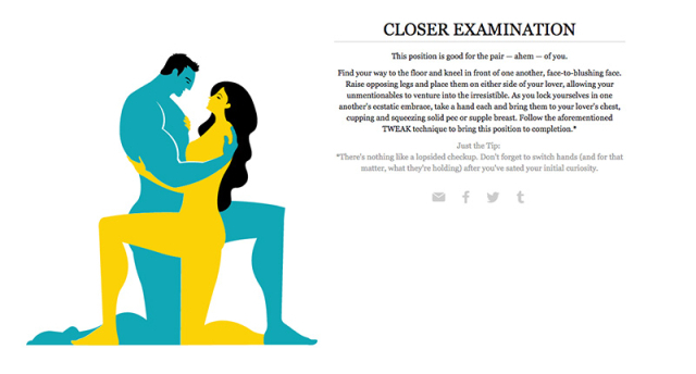 As “posições” procuram mostrar como os casais podem se ajudar a prevenir alguns tipos de câncer e recebem nomes criativos, com trocadilhos bem pensados.