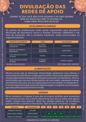 A cartilha foi elaborada em duas versões. Uma voltada à população em situação de rua, que traz orientações para a prevenção, informações sobre sintomas da doença, o que fazer em caso de suspeita e direcionamento a hospitais para pronto atendimento, além de fornecer uma lista com redes de apoio, como lugares para se alimentar e tomar banho. A segunda versão é destinada aos voluntários que atendem a essa população.