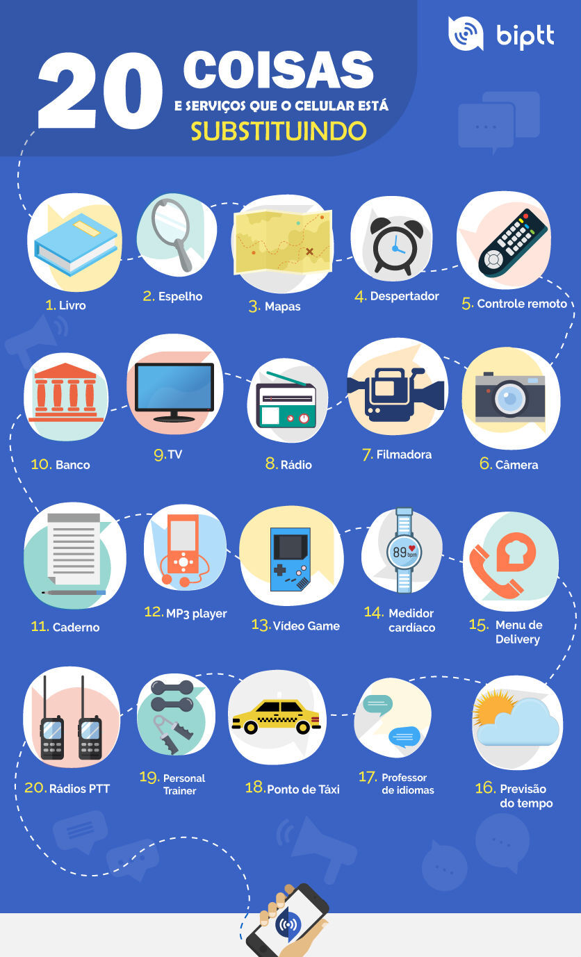O pessoal do BiPTT, plataforma de comunicação instantânea de voz, elaborou um infográfico que mostra 20 coisas ou serviços que o celular está substituindo. Confira abaixo: