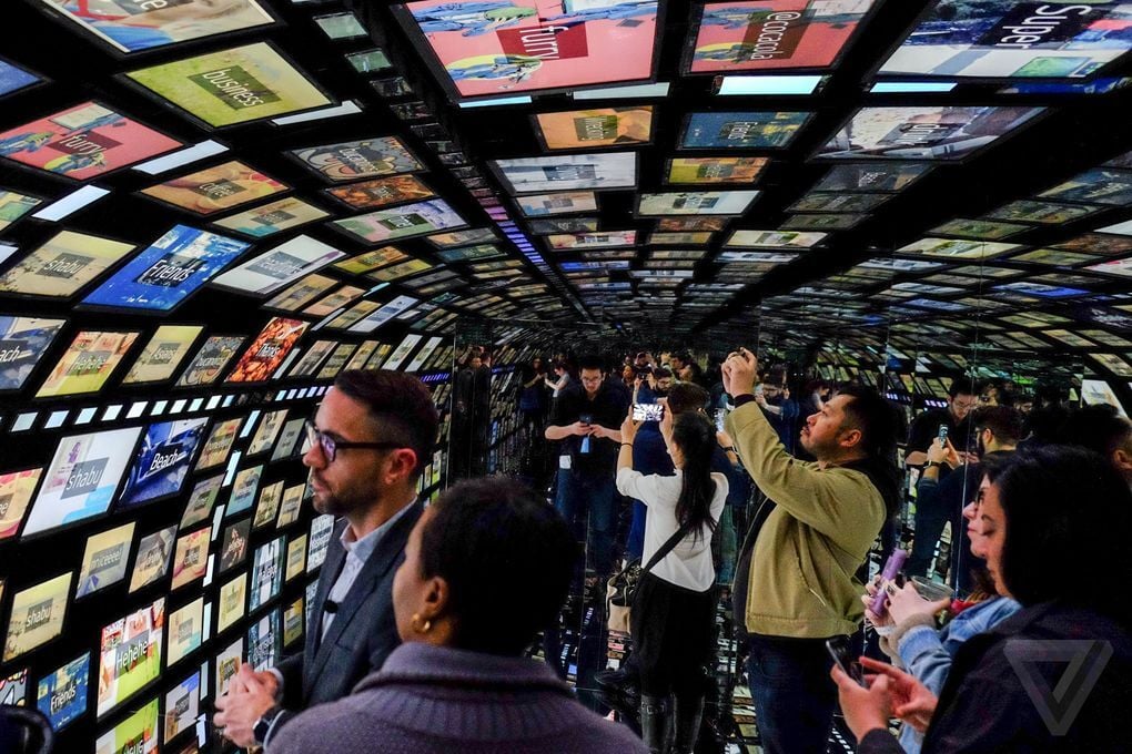 A navegação pela “Social Galaxy” acontece em duas etapas. Na primeira parte, o usuário atravessa o túnel das próprias experiências. Para isso, digita a conta do seu Instagram num dispositivo conectado ao espaço, construído com mais de 300 telas. A viagem termina numa cabine onde um celular está à disposição para que o visitante faça uma “mega selfie” –a imagem é refletida num telão equivalente a três andares de altura composto por 96 telas de LED.