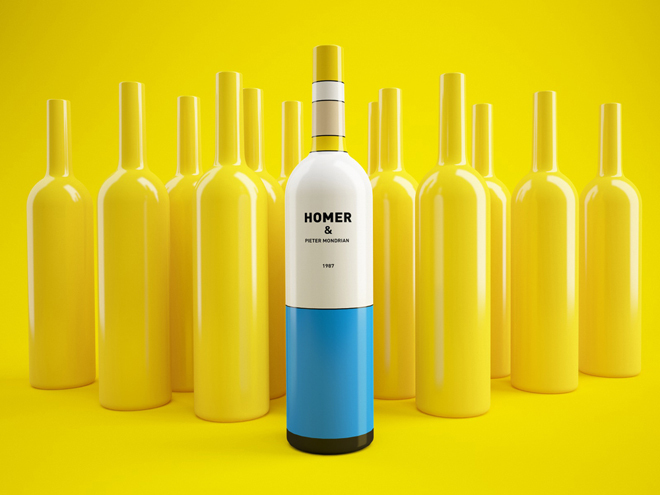 Inspirado nas obras do pintor modernista holandês Pieter Mondrian, os designers russos Constantin Bolimond e Dmitry Patsukevich transformaram Homer e Marge Simpson em garrafas de vinho.