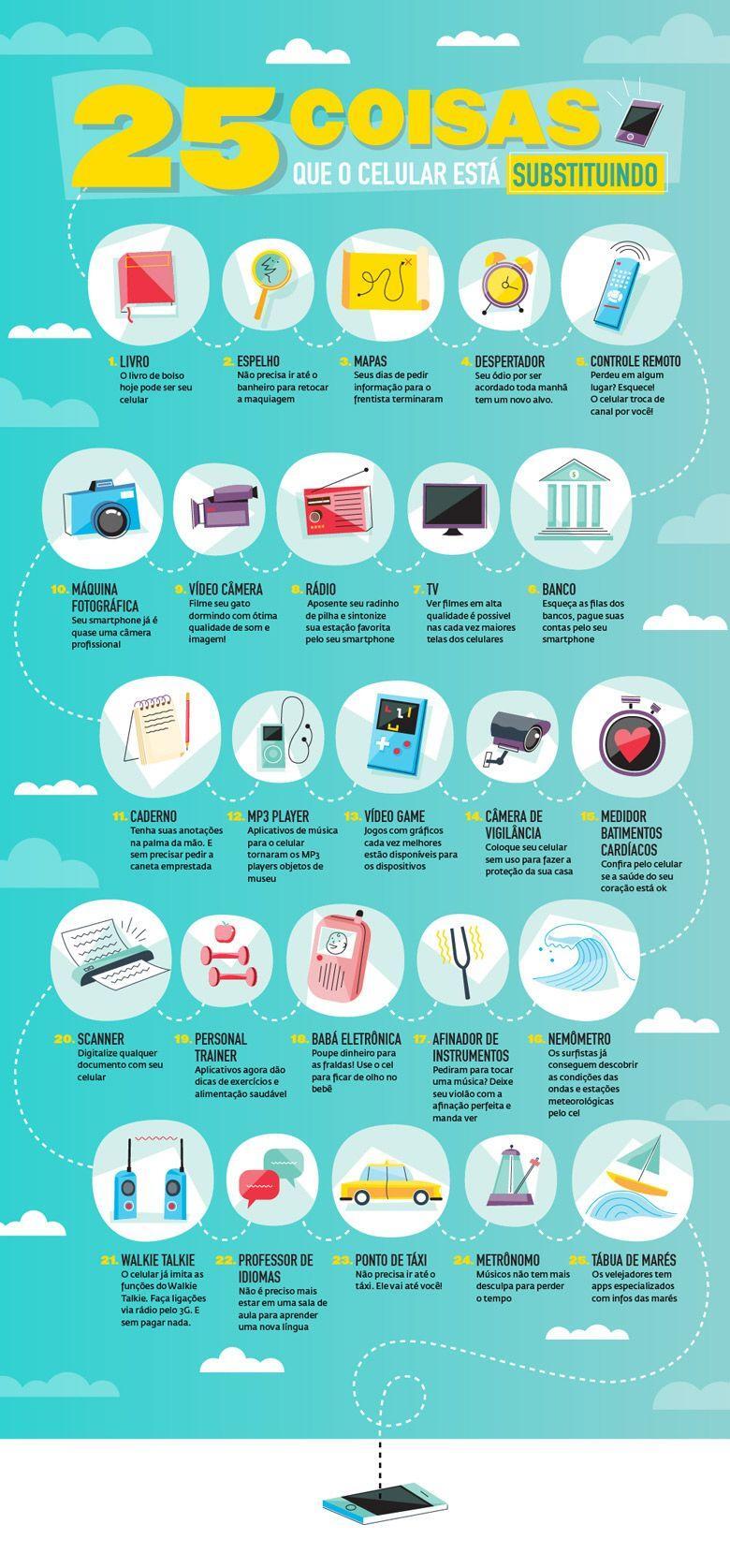 O pessoal do Baidu elaborou um infográfico que mostra 25 coisas que o celular está substituindo. Confira abaixo: