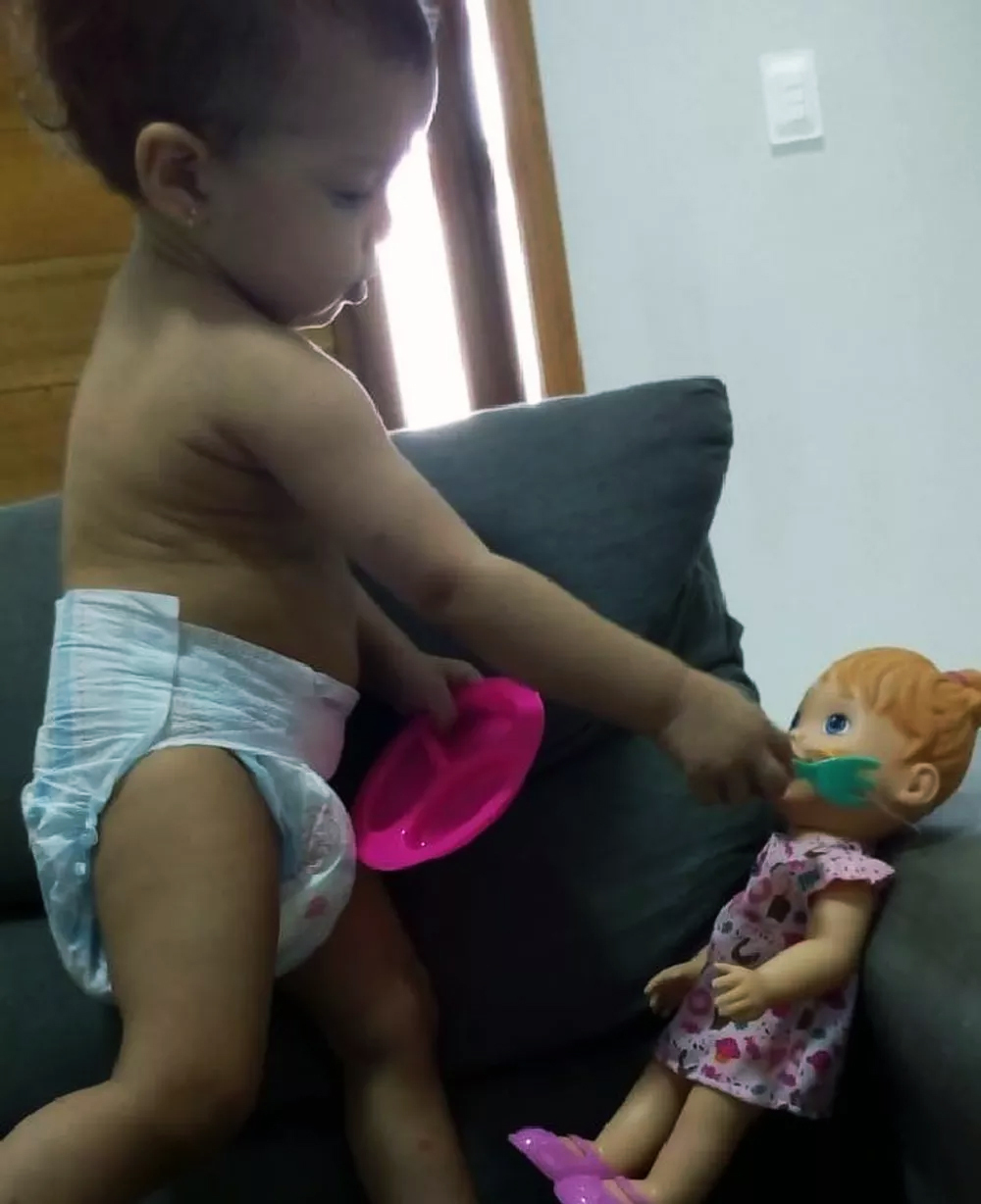 “A gente fica tentando fazer com que ela coma. Pensei que se ela visse alguém parecido com ela comendo, iria incentivar”, explica a fonoaudióloga. “Daí comprei uma boneca parecida com ela e coloquei a sonda. Agora elas são inseparáveis e ela está aprendendo que a boneca usa sonda e come pela boca. Ela mesmo dá a comidinha”, diz Sampaio.