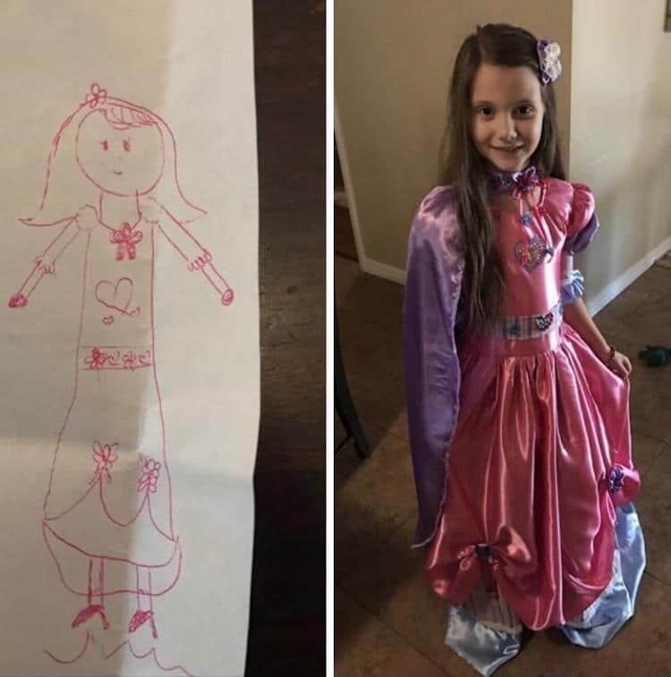 De acordo com uma publicação no Reddit, uma menina de identidade não revelada desenhou o vestido de seus sonhos. Caracterizado por babados típicos de um clássico vestido de princesa da Disney, o desenho parecia algo reservado para um conto de fadas.