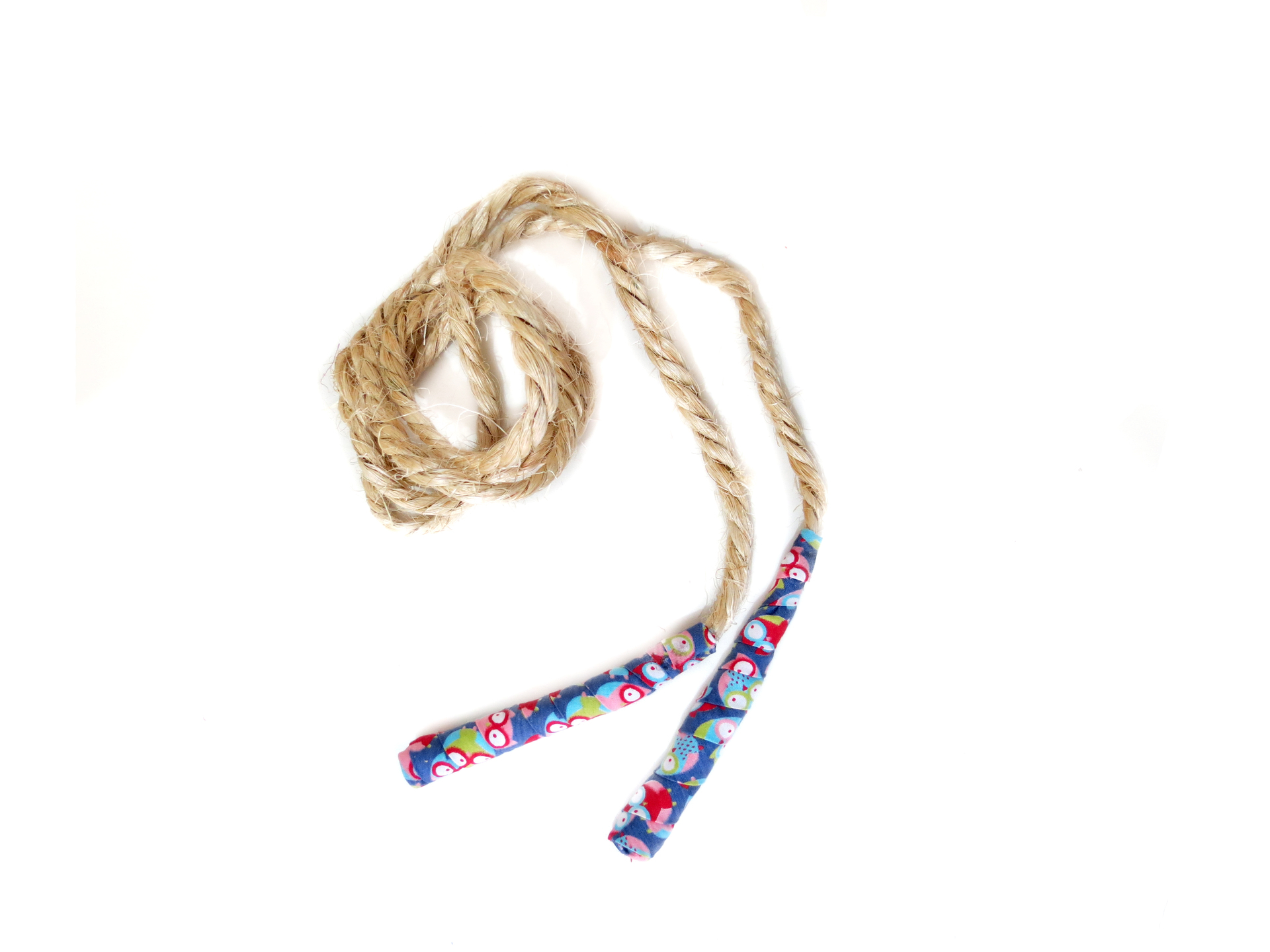 A corda feita pelo grupo Divas da Criação é de sisal e os punhos levam revestimento em tecidos de algodão reaproveitado de sobras de confecções. R$ 23.