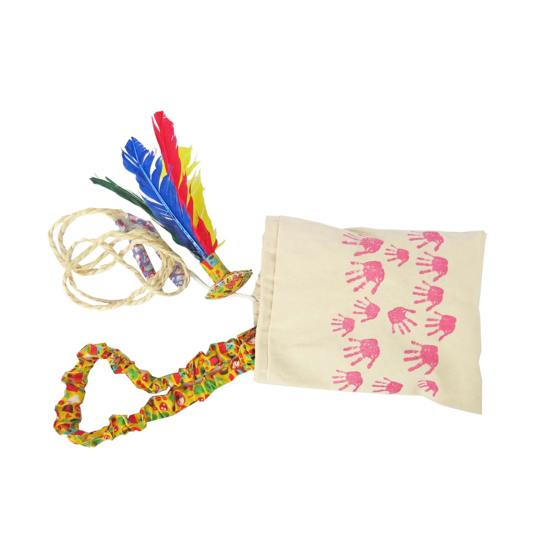 O saquinho traz um kit com três brinquedos: corda, elástico e peteca. R$ 59.