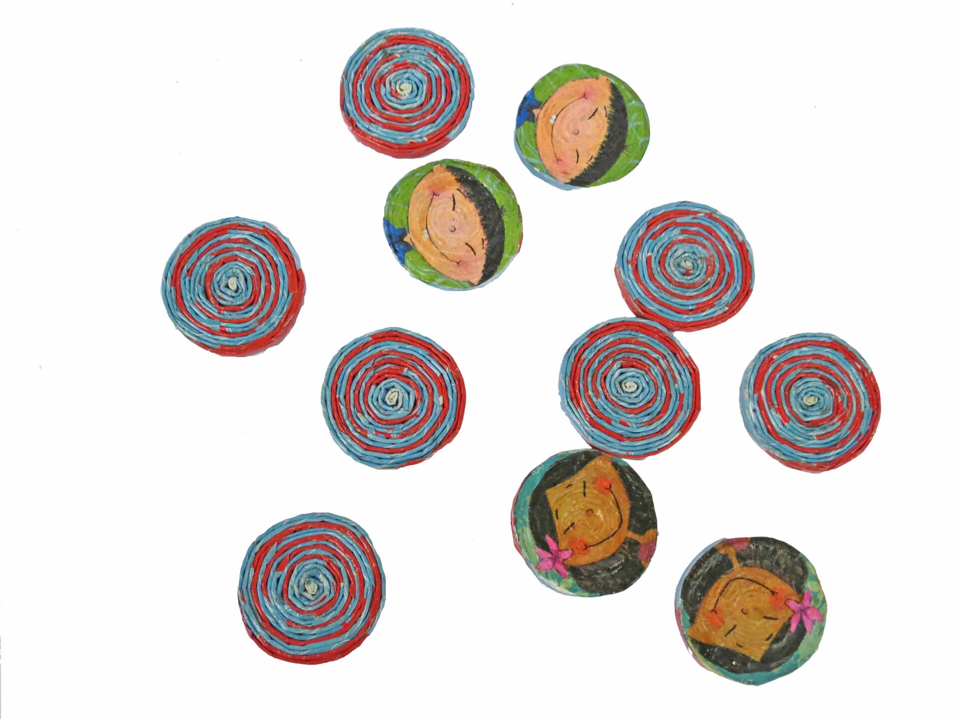 Para o jogo da memória, o grupo Artejor reaproveita revistas. As artesãs fazem canudos de folhas e depois enrola-os, formando peças circulares, que são envernizadas, para durarem mais. São nove pares de personagens, representando várias etnias. Vem em uma embalagem de garrafa PET com zíper. R$ 49,90.