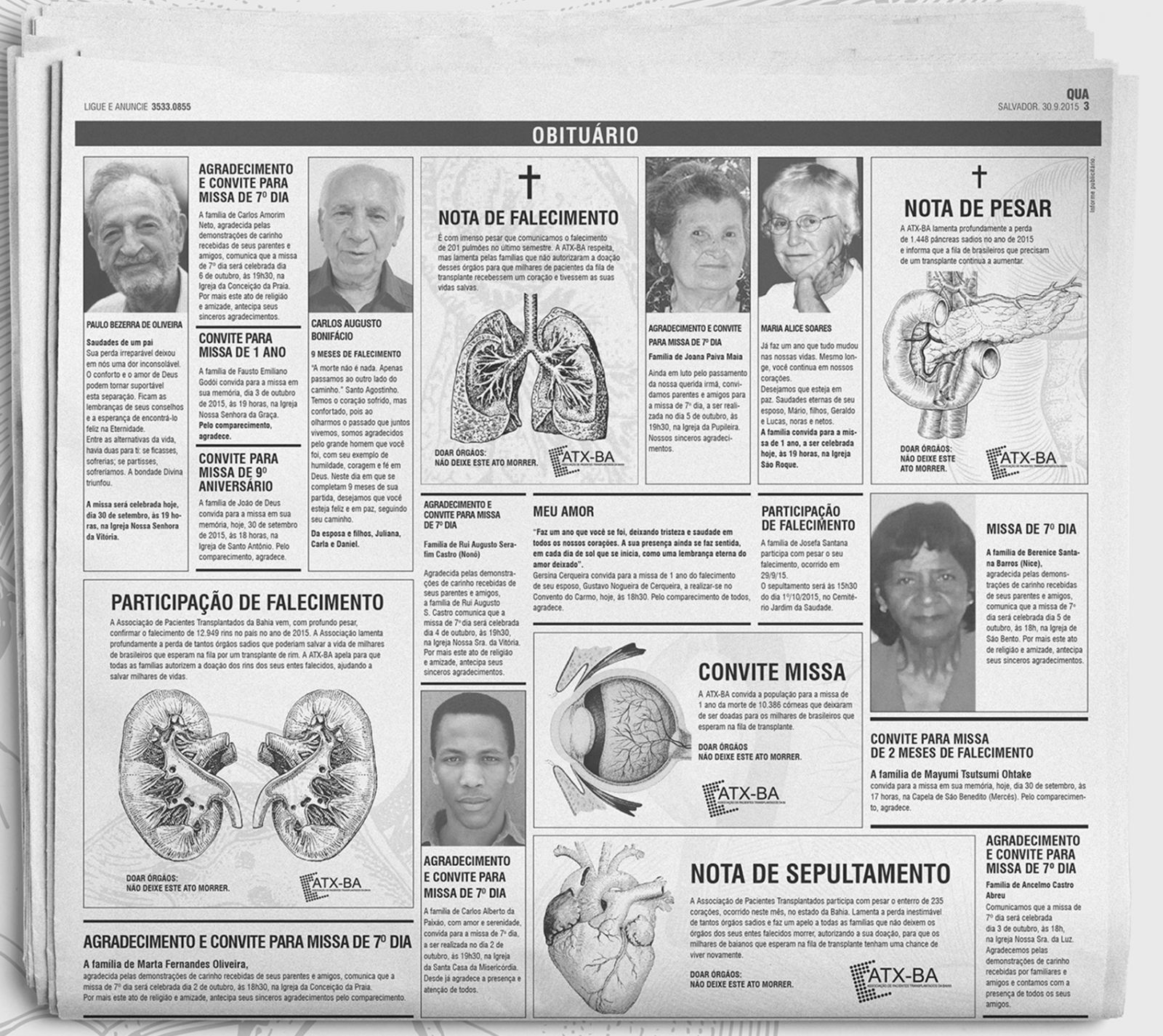 Numa ação publicitária inusitada, os obituários de jornais de grande circulação de Salvador receberam anúncios comunicando a morte de milhares de órgãos que poderiam ter sido doados a pacientes na fila para um transplante.