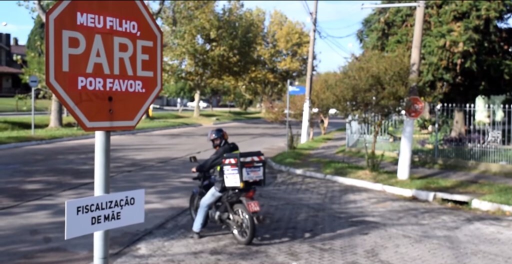 Em Pelotas (RS), a sinalização ganhou mensagens inusitadas para evitar acidentes no trânsito e homenagear as mães. Na placa, foram colados adesivos para que o motorista lesse: “Meu filho, pare, por favor”.