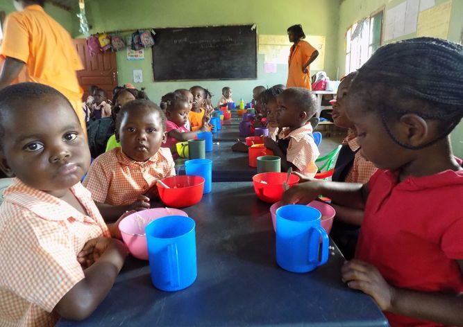 As crianças fazem uma única refeição, bancada pela escola: o almoço, em que podem ser servidos “chima” (prato feito com farinha de milho) com couve, arroz com peixe, sopa de macarrão ou papa.