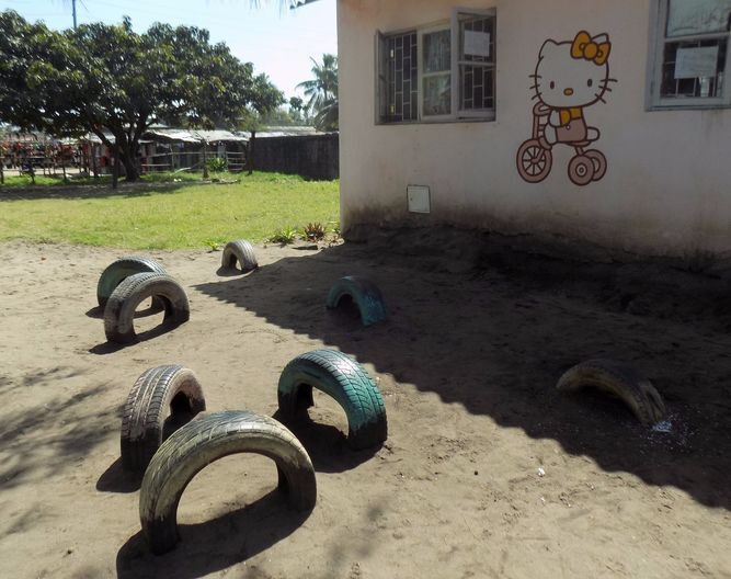 O “playground” é o quintal da igreja e os “brinquedos” são alguns pneus. Assim, a ideia é fornecer estrutura básica para que as crianças sigam frequentando as aulas. Caso você queira contribuir, clique aqui.